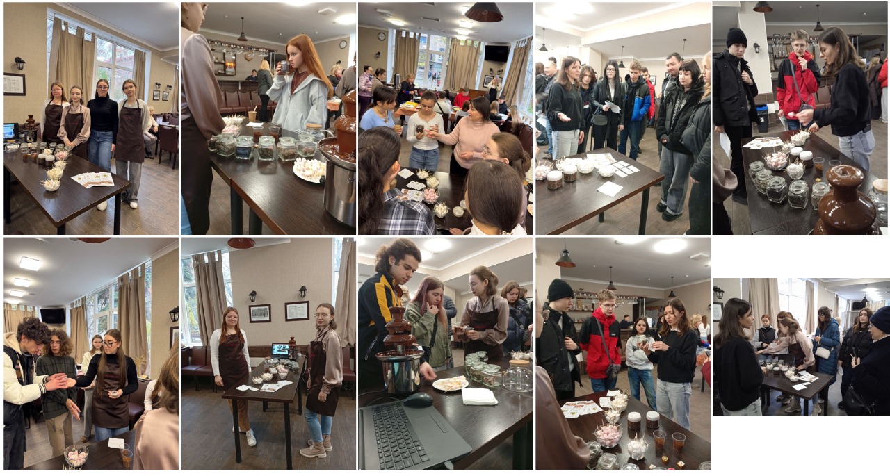 Від кафедри був проведений майстер-клас “Світ кави та чаю”, на якому школярам пропонували спробувати відгадати  до якого сорту відносяться кавові зерна та чай, навчитись візуально визначати зерна різних сортів – Арабіки та Робусти. В процесі проведення майстер-класу учні також дізналися цікаві факти про чай,  особливості вирощування та виробництва різних видів чаю: чорного, зеленого, жовтого, білого та бірюзового чаю Улун.