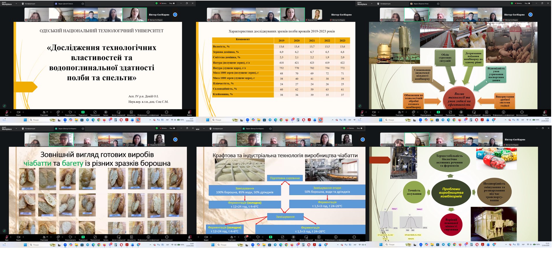 23 квітня відбулося засідання секції «Зберігання, технології переробки зерна, виготовлення зернових, хлібопекарських виробів та комбікормів», у рамках якого співробітниками та аспірантами кафедри було представлено 2 усні та 22 стендові доповіді за основними напрямами наукової школи «Розробка нових ресурсозберігаючих технологій виробництва хлібопродуктів і кондитерських виробів», що охоплюють сучасні підходи до переробки зернової сировини, удосконалення технологій борошняних виробів (хлібобулочних, кондитерських, макаронних виробів) та харчоконцентратів, впровадження ресурсозберігаючих рішень.